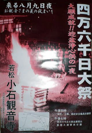| 観音菩薩様の縁日は7月10日で、この日にお参りすると普通の日のお参りの四万六千倍の御利益、御加護があるとされています。(126年間、毎日御参りしたということになるそうです) 通称 中畑の観音様は毎年8月9日を四万六千日の御縁日とし、護摩焚き、火渡りの行を行ないます。 |