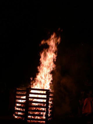 | 願い事を書いたお札を火中に投げ入れます。 脚半を巻いた若い行者さんにに注目。この方が印を結んで火渡りの荒行をされました。 |