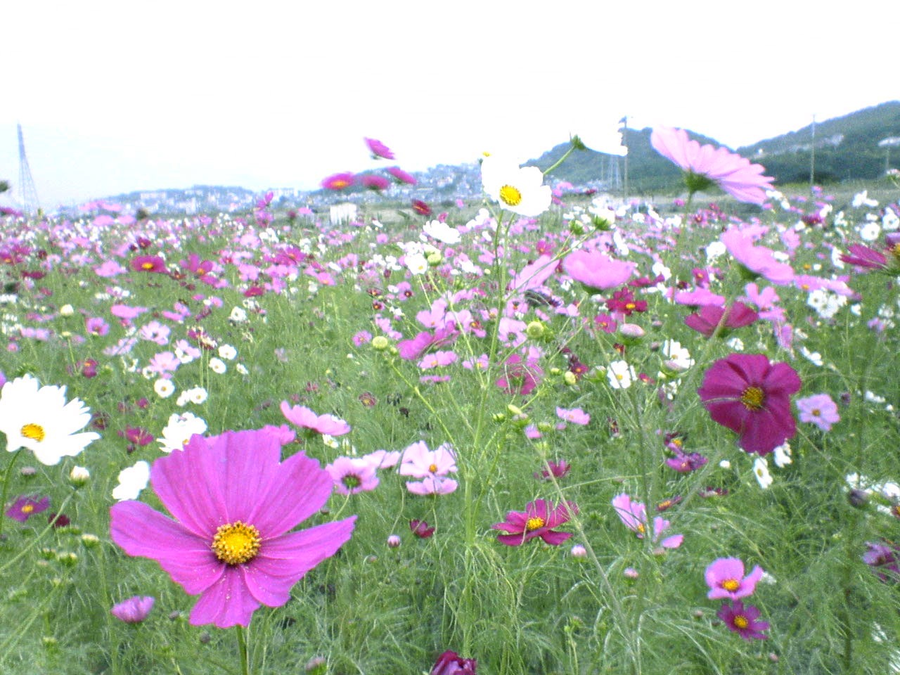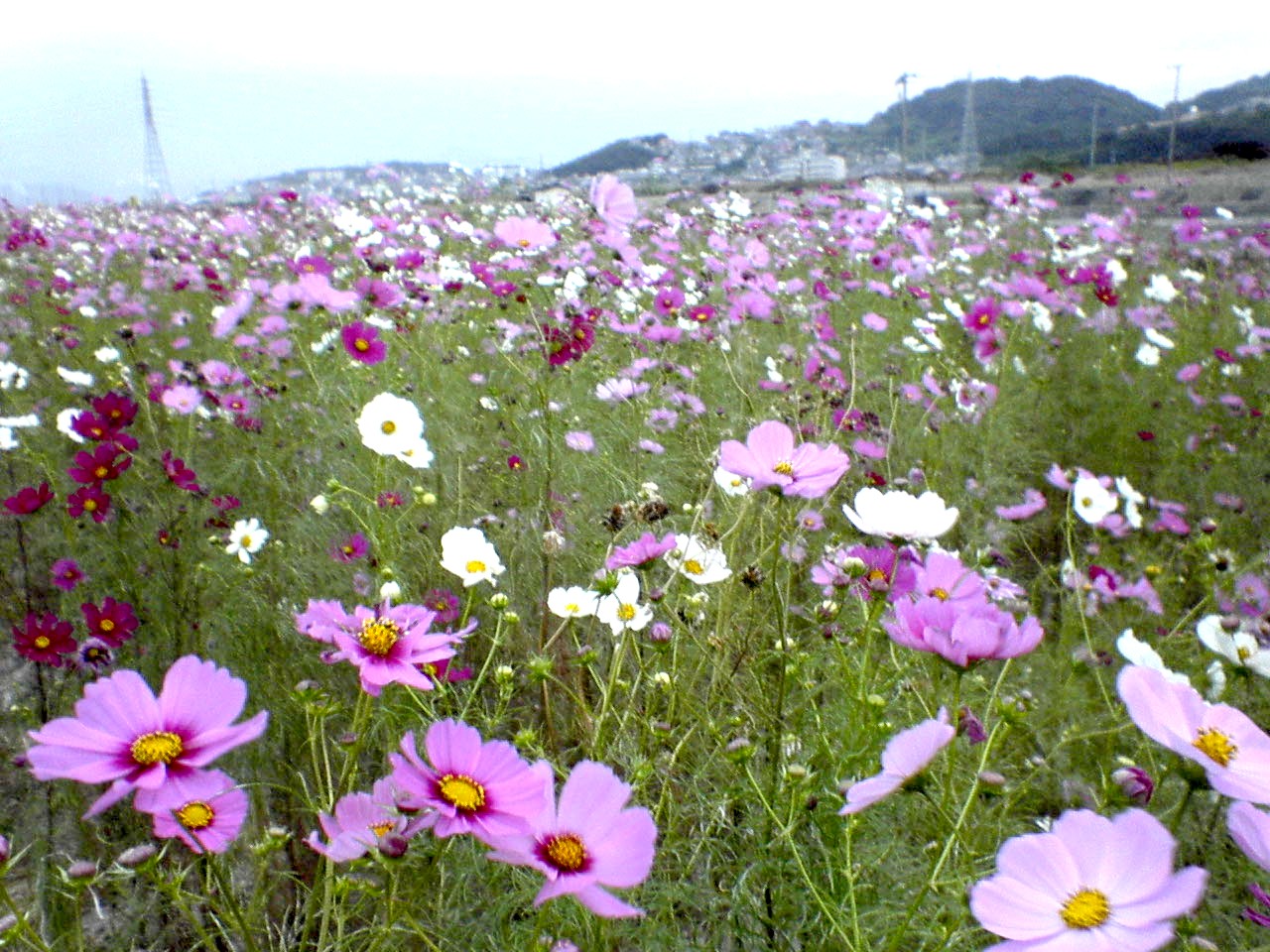 | 響灘の埋立地を昔の海岸線に沿って伸びる国道495号線の、赤崎〜脇の浦辺りは、道路脇にコスモスが咲き並ぶ「コスモス街道」として整備されています。 不毛な埋立地の中にボランティアの方々のそれぞれの思いを込められたコスモスが咲きそろう様は可憐で、区役所によると例年約9万人が訪れるそうです。(中にはコスモス以外の花を育てられている方もあり、少し残念でした。) |