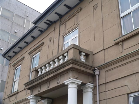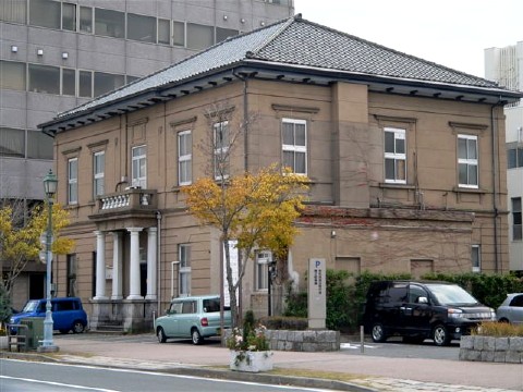 石炭商同業組合が組合事務所として、木造二階建て、数奇屋寄棟、外壁モルタル塗りで清水組施工により1905年建築。業種は変わったけれど現役営業中。