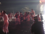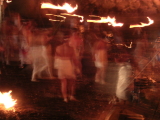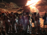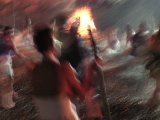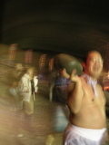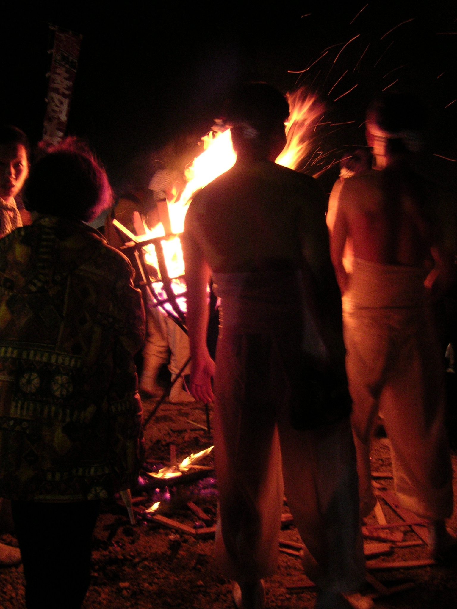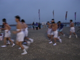 | 午後5時。蛭子神社で全員で潔斎、祭りが始まる。 浜で若潮を汲み妙見神社に奉納、 その後4km離れた小竹の白山神社に駆け上り参拝する。 |
