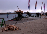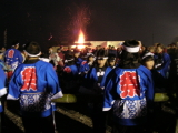 | 祭りを締めくくる花火。冬の海の澄んだ夜空を花火が彩る。 | ||