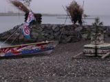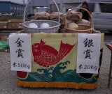 | 玉せせりの際に御座船から海中に投じられる金銀の玉。 お神酒として幾樽もの振る舞い酒が提供される。 一般の参観者も力石を奉納できる。 |