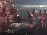 | 浜に戻った男たちが海中に飛び込み蛭子神社に奉納する力石を採る。 採った石が大きいほど大漁や良縁に恵まれるといわれ、男たちは 石の大きさを競い、より深い水中を目指す。 |