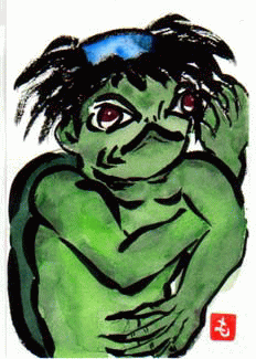 浅く、「何かやろう」と思い詰めた我々のシンボルキャラクターの「げんげの花子」です。 こまねいていた腕組みを解き掛けているのです。 |