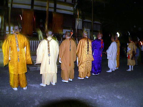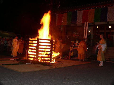 | 願い事を書いたお札を火中に投げ入れます。 脚半を巻いた若い行者さんにに注目。この方が印を結んで火渡りの荒行をされました。 |