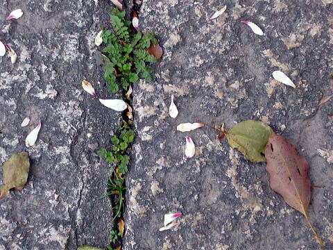 | 花びらが一面に散っていました。 神社に多い おがたまの樹 の花びらでした。 |