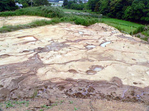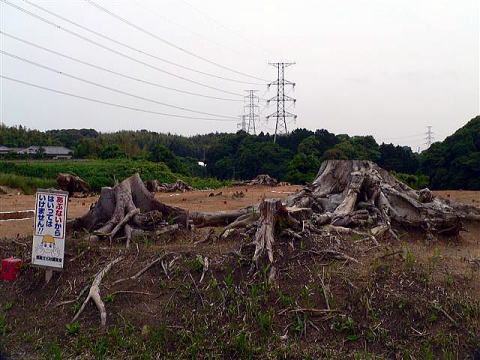 道路工事のため表土を剥ぎ取られ切り倒された巨木の根が累々と有りました