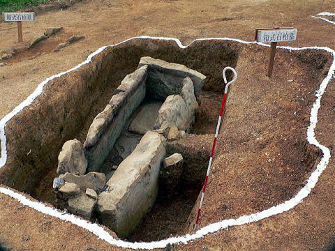 箱型石棺は集落のリーダーの物ではないかと説明が有りました。石棺の蓋は三枚の大きな石で覆われていましたが、発掘の時砕いて廃棄したそうです。