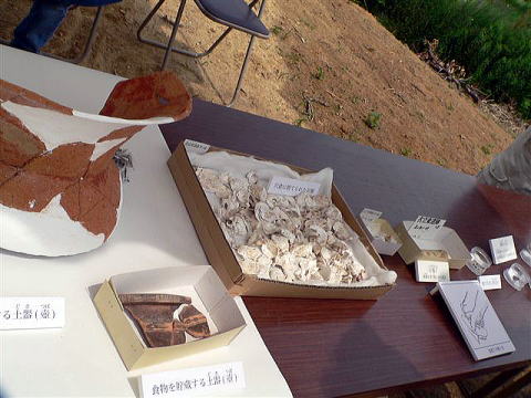 住居跡や穴倉から弥生式土器や石斧、石包丁〔稲などが現代のように、一斉に実るということは無く熟れた穂だけを切るのに用いた〕、磨り潰すための平たい石と円筒状の石の杵、イノシシなどを狩ったと思われる黒曜石などの石鏃が出土。