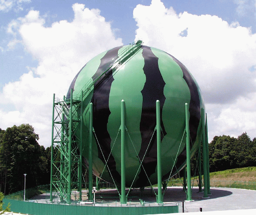 この巨大なスイカは,千葉県富里町にある直径約34mのガスホルダーです。